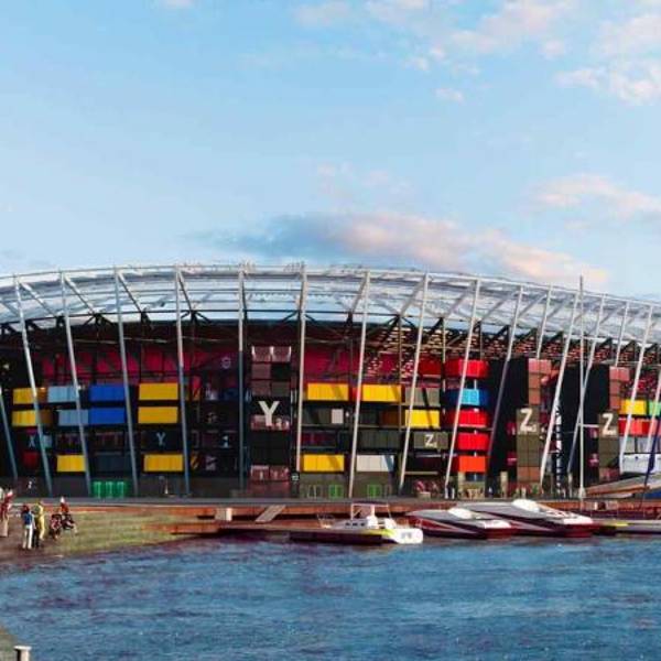 Todo encaja en una construcción compuesta por los citados contenedores que, unidos a módulos de tren y con las medidas de altura máxima (2'89 metros) y el ancho estándar (2'44 metros) con longitudes variables entre los 6.10 y los 12'19 metros, forman uno de los estadios más curiosos y llamativos de todo el Mundial.