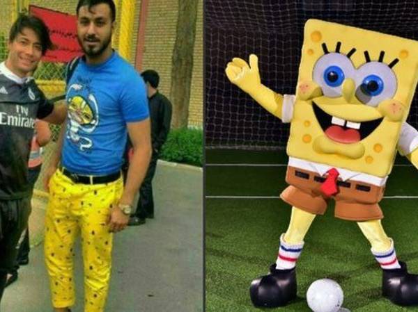 Además, el portero del Persepolis compartió la foto en redes sociales y bromeó comparando los pantalones con el persona de dibujos animados Bob Esponja.