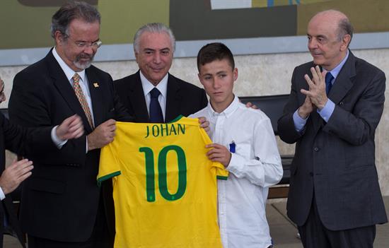 El joven, conocido desde la tragedia como "niño ángel", fue el más aplaudido en la ceremonia y recibió de manos del ministro de Defensa de Brasil, Raúl Jungmann, una camiseta de la selección brasileña de fútbol.