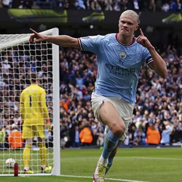 Dos de los goles fueron aún en el primer tiempo: el primero suyo, en el 34, el 2-0, fue un cabezazo en un saque de esquina que sacó ya de dentro Malacia y que debería implicar una reflexión a Erik Ten Hag, porque el marcador era Christian Eriksen, del que el delantero se deshizo con suma facilidad; el segundo, el 3-0, en el minuto 37, al lanzarse para el remate con la izquierda en un centro maravilloso de De Bruyne (ha participado en 31 goles en sus últimos 31 partidos de Liga, 16 como definidor y 15 como pasador).