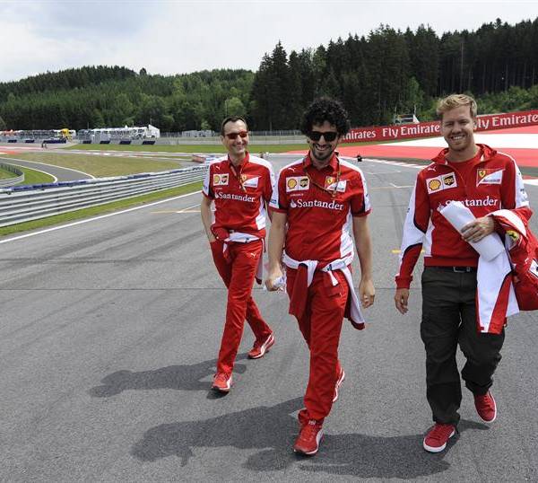 El piloto de Scuderia Ferrari Sebastian Vettel (dcha) comprueba el asfalto con motivo del Gran Premio de Austria