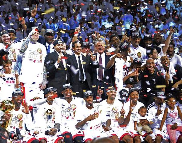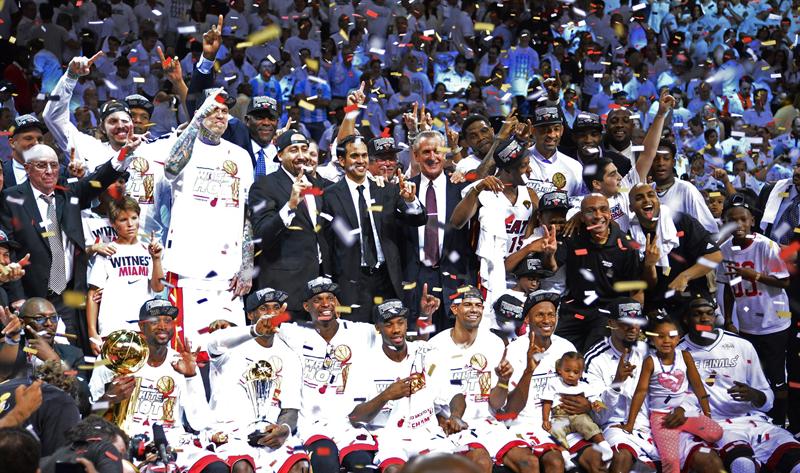 Los Heat, que estuvieron a cinco segundos de perder el título en el sexto partido antes que anotase un triple salvador el escolta Ray Allen, remontaron una desventaja de 2-3 que tenían en la serie al mejor de siete y fueron el último equipo desde la temporada del 2010 que ganaron los dos últimos encuentros de las Finales.