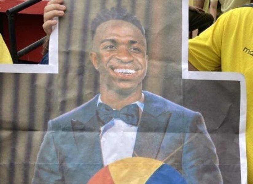 Además, otro hincha llevó impresa una imagen de Vinícius cargando un balón de playa vistiendo de traje.