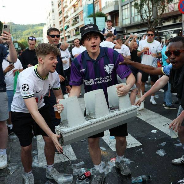 Hinchas del Tottenham causando daños en la vía pública de España.( )