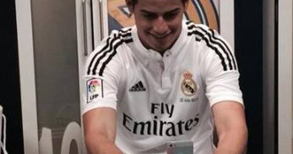 La flamante contratación del Real Madrid, el colombiano James Rodríguez, se tomó un selfie en el camerino de su nueva institución.