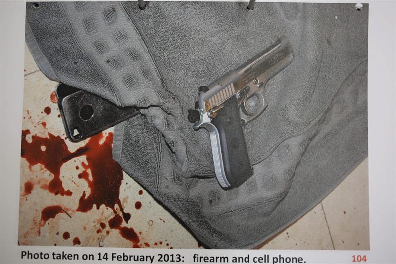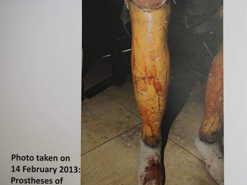 Fotografía distribuida por la Policía sudafricana que muestra la pierna ortopédica del atleta sudafricano manchada de sangre tras disparar y acabar con la vida de su novia -
