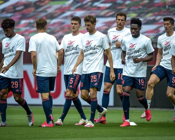Los jugadores del Bayern Múnich, el líder del campeonato de Alemania, realizaron este sábado el calentamiento con una camiseta con la inscripción "Tarjeta roja al racismo - BlackLiveMatters", antes del partido en campo del Bayer Leverkusen. El gran club alemán se une a la serie de protestas contra el racismo tras la muerte en Estados Unidos de George Floyd, un hombre negro matado por un policía y cuyo fallecimiento ha originado muchas manifestaciones en su país y en el mundo. El central del Bayern, Jérôme Boateng, de padre ghanés, había apelado esta semana a sus colegas blancos a manifestar más abiertamente su solidaridad y su rechazo al racismo. "Todos los deportistas blancos que no se expresan actualmente no son racistas, evidentemente", dijo, "pero naturalmente es deseable que utilicen su notoriedad también para esta causa". La semana pasada en Bundesliga, jugadores habían manifestado su emoción de manera individual durante los partidos tras haber marcado un gol. El francés Marcus Thuram había puesto una rodilla en tierra, el joven delantero inglés del Borussia Dortmund, Jadon Sancho (20 años), así como el defensa marroquí Achraf Hakimi habían mostrado una camiseta con la inscripción "Justicia para George Floyd". El centrocampista estadounidense de Schalke 04, Weston McKennie, lució un brazalete con la misma inscripción. El jueves, fue todo la plantilla del Borussia Dortmund, segundo en la clasificación, la que hizo el mismo gesto de poner una rodilla en tierra en el entrenamiento, con los 28 jugadores haciendo la forma de un corazón.