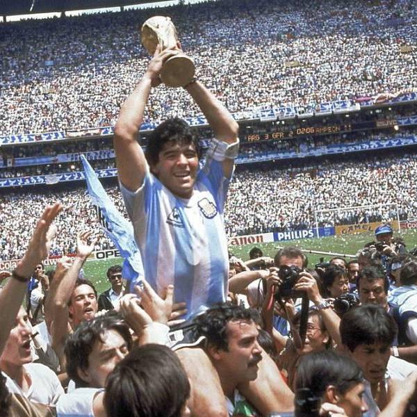 En esta foto del 29 de junio de 1986, Diego Maradona alza la Copa Mundial tras la victoria de Argentina 3-2 ante Alemania en la final, en el estadio Azteca de la Ciudad de México. ( )