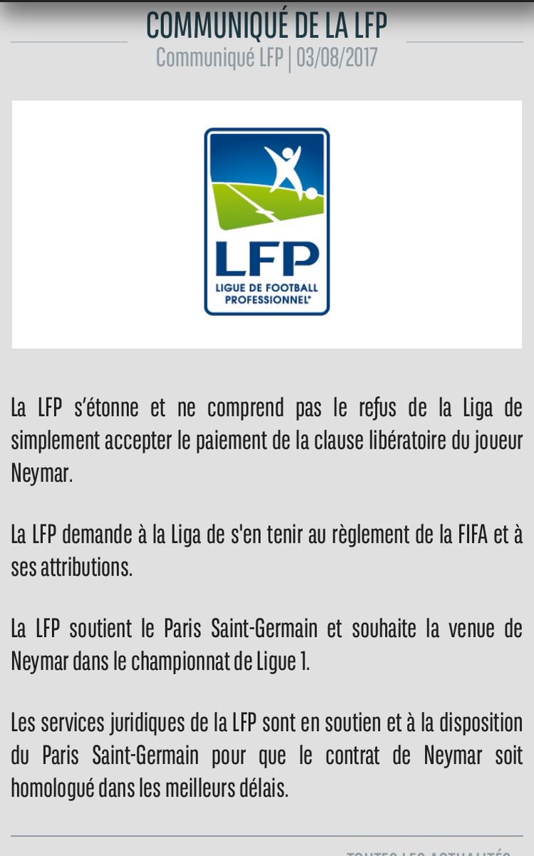 "La LFP apoya al París Saint Germain y desea la llegada de Neymar al campeonato Ligue 1. Los servicios jurídicos de la LFP apoyan y están a disposición del París Saint Germain para que el contrato de Neymar sea homologado en el plazo más corto", añadió la competición en un comunicado.