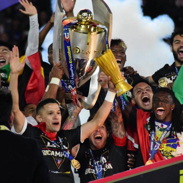 Jugadores de Liga de Quito alzan el trofeo de campeón de la Liga Pro 2024( )