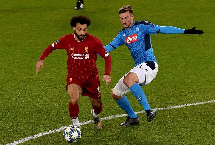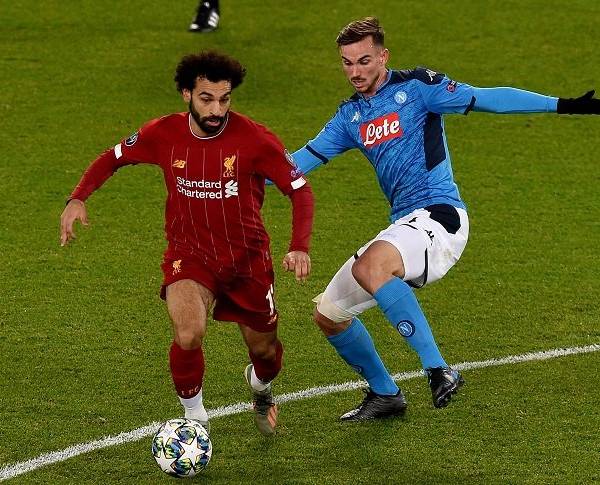 Salah del Liverpool ante la marca de un elemento del Napoli