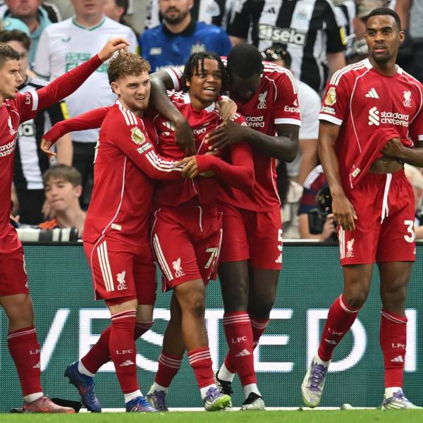 El delantero inglés del Liverpool, #73 Rio Ngumoha (C), celebra con sus compañeros después de anotar el tercer gol durante el partido de la Premier League inglesa entre Newcastle United y Liverpool en St James' Park( )
