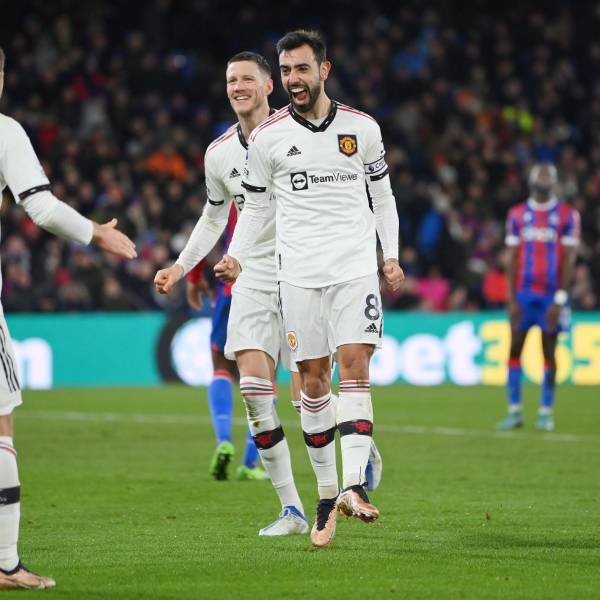 Bruno Fernandes (d) festeja junto a Christian Eriksen y Wout Weghorst (atrás) el tanto que abrió el marcador ante el Crystal Palace.( )