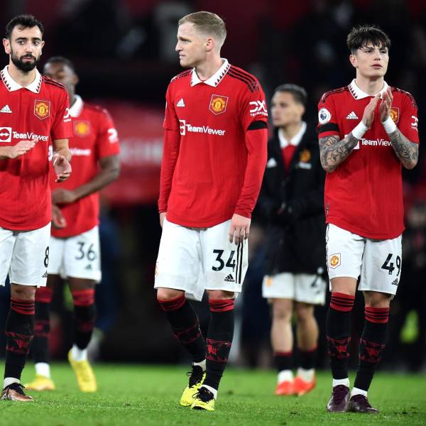 Bruno Fernandes (i), Doney van de Beek y Garnacho (d) aplauden a los hinchas del Manchester United tras la victoria sobre Nottingham Forest.( )