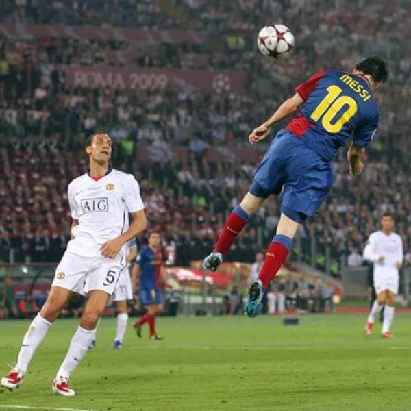 Messi impactó el balón de cabeza a más de dos metros y medio de altura tras un pase de Xavi Hernández. El argentino perdió una bota en su salto y dejó una imagen para la historia del fútbol.
