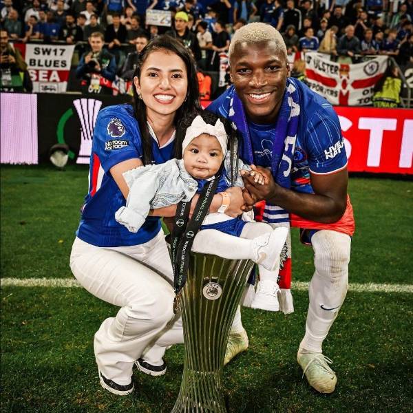 Luego del triunfo ante el Betis, el Chelsea publicó en sus redes sociales una foto de Moisés Caicedo con la bandera de Ecuador amarrada en su cintura, acompañado de Paola y de su hija. Una familia que ya sabe lo que es levantar un título europeo.