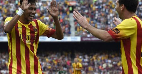 Neymar jugó por primera vez como titular en la la liga española esta temporada, acompañado por el canterano Munir El Haddadi, el joven delantero de origen marroquí, que debutó como internacional con la selección absoluta española el lunes en el triunfo contra Macedonia (5-1).