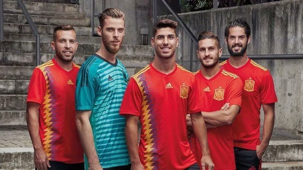 La camiseta es roja con las tres rayas amarillas, el logo de la marca deportiva que la patrocina en los hombros, pero su principal peculiaridad son los ribetes en forma de diamantes rojo, amarillo y azul que adornan el costado derecho, que "representan la velocidad, la energía y el estilo del fútbol que se asocia con el combinado nacional español".
