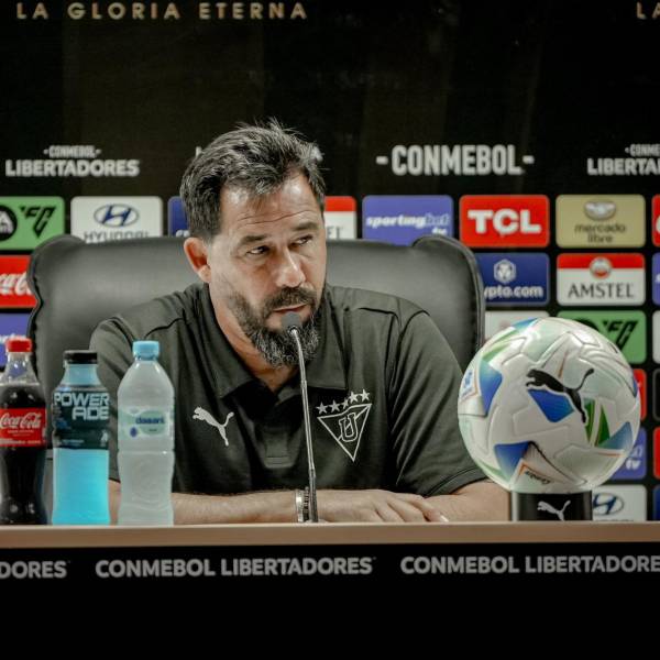 El entrenador de Liga de Quito, Pablo Sánchez, en rueda de prensa ( )
