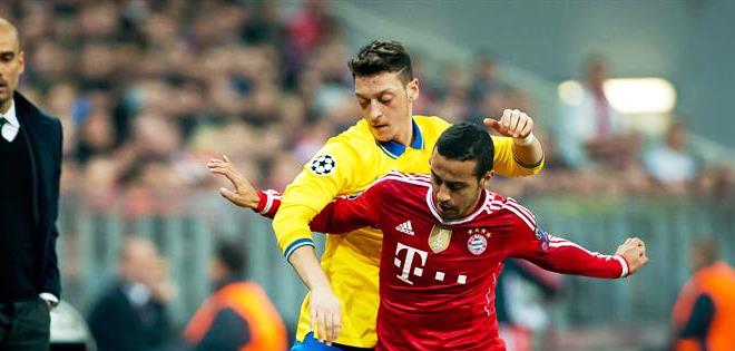 MÚNICH, Alemania.- Thiago Alcantara (d) del Bayern Munich trató de escaparse de la marca de Mesut Ozil. Foto: EFE.