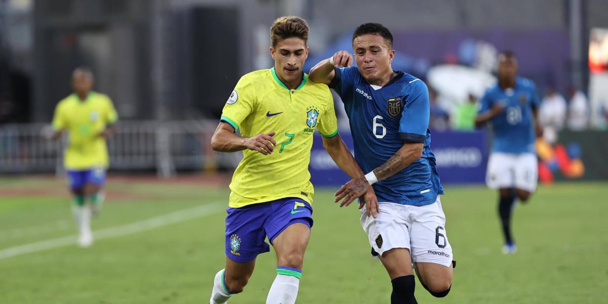 Gabriel Pirani de Brasil disputa el balón con Layan Loor de Ecuador en un partido del Torneo Preolímpico Sudamericano Sub-23 ( )