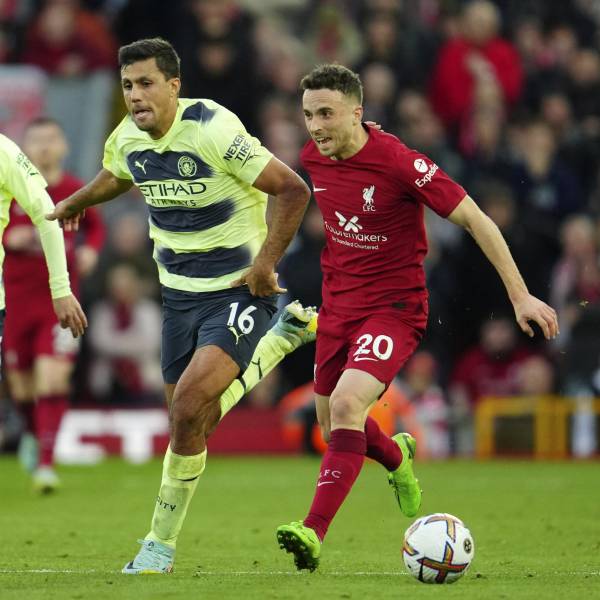 Diogo Jota (derecha) de Liverpool disputa el balón con Rodrigo del Manchester City en el partido de la Liga Premier, el domingo 16 de octubre de 2022. (AP Foto/Jon Super)( )