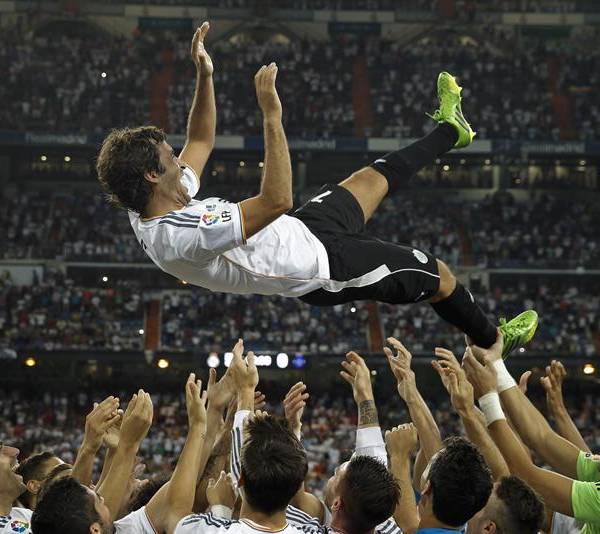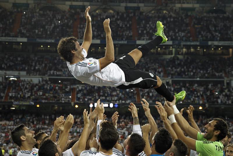 Del césped, Raúl dio sus siguientes pasos hacia el vestuario y del vestuario salió al campo de nuevo, ya vestido de blanco, y entre los aplausos de los 22 jugadores que iban a disputar el partido. Las copas más importantes que ganó adornaron la foto, que lució mejor en el palco, donde subió para ser abrazado por el rey Juan Carlos, Florentino Pérez y el ministro de Educación, Cultura y Deporte, José Ignacio Wert.