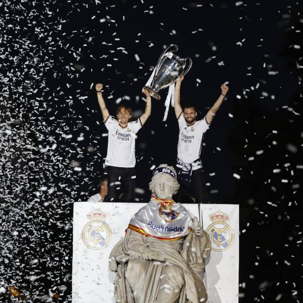 Los jugadores del Real Madrid dedicaron a la afición madridista que abarrotó la Puerta del Sol el trofeo de la decimoquinta de Europa y escucharon los cánticos con dos peticiones principales, al capitán Nacho Fernández que renueve un año y no se marche del club, más el Balón de Oro para el brasileño Vinícius Júnior.