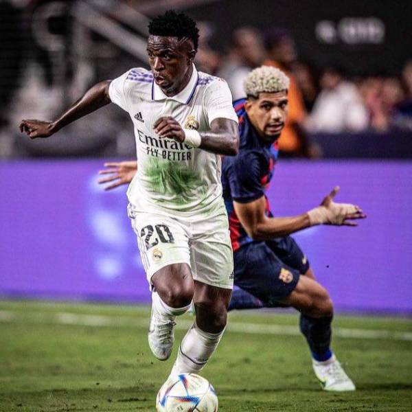 Vinicius Jr jugador de Real Madrid dribla al defensa blaugrana Ronald Araújo