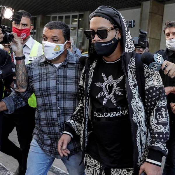 Ronaldinho Gaúcho, usando una mascarilla, caminó por entre fotógrafos, camarógrafos y reporteros sin responder a ninguna pregunta y ingresó en un vehículo particular que lo esperaba.