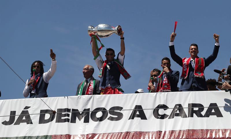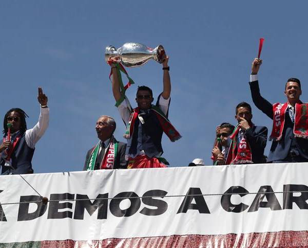 El capitán de la selección de Portugal, Cristiano Ronaldo, levantó el trofeo de la Eurocopa-2016 desde un balcón del palacio presidencial ante una multitud de hinchas que entonaron con emoción y patriotismo el himno nacional junto a sus héroes, este lunes en Lisboa.