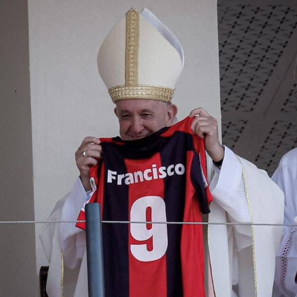 En el Vaticano era común que los fieles le acercaran banderas y casacas del equipo que el pontífice siempre abrazaba con alegría.