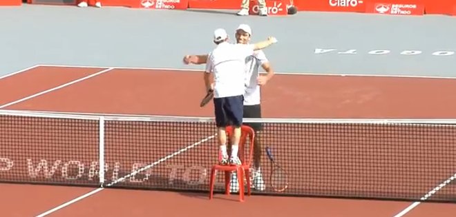 El tenista israelí, Dudi Sela, cayó derrotado ante el croata Ivo Karlovic, y tal como se estila en el tenis fue a saludar a su contrincante pero con una silla para poder alcanzarlo.