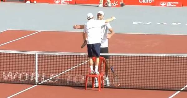 Como no alcanzaba a su rival fue a buscar una silla para poder saludarlo al final del partido.