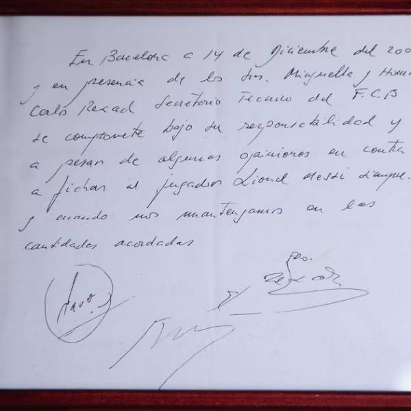 Firmada en tinta azul por Carles Rexach, quien en ese entonces era el director deportivo del club azulgrana, la servilleta partió con un precio inicial de USD 375,000.