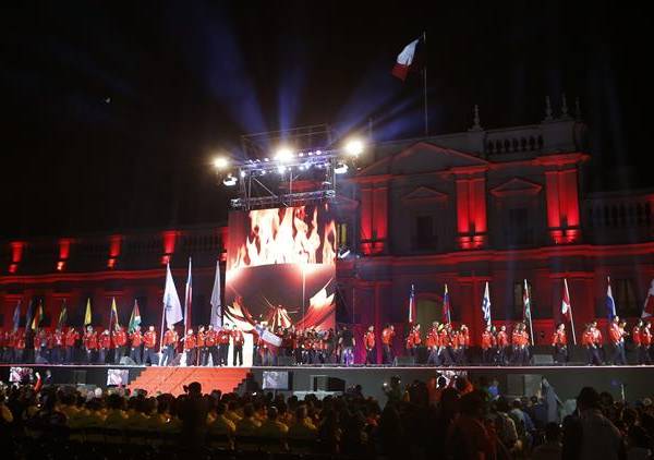 Bailarines del Ballet Folclórico de Chile interpretaron algunas danzas típicas de países latinoamericanos antes de dar paso al desfile de los atletas, que cruzaron la pasarela instalada frente al palacio presidencial mientras saludaban al público.