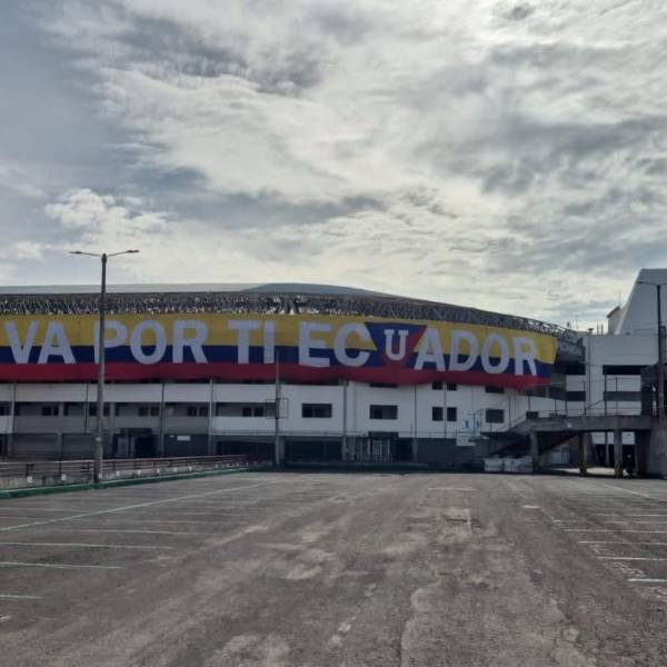 La bandera de "Va por ti Ecuador" en el estadio Rodrigo Paz Delgado. ( )