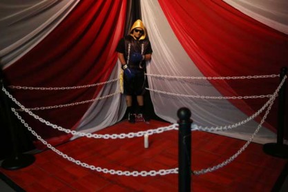 Vestido como si fuera a participar en un combate y colocado de pie en la esquina de un ring, el cuerpo de un joven boxeador es velado hoy por familiares y amigos, de acuerdo a una excéntrica y cada vez más popular costumbre en Puerto Rico de mostrar a los "muertos paraos".