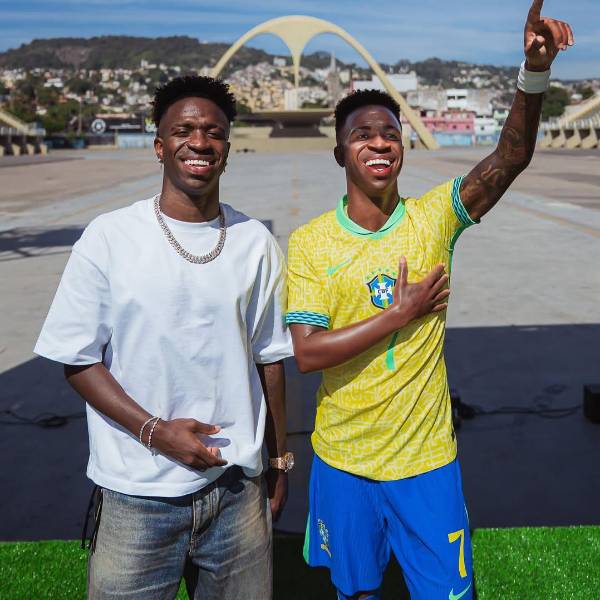 Las fotografías muestran a un Vini sonriente y en una pose relajada, vestido con el uniforme de la Canarinha y con una mano en el corazón y otra levantada hacia el cielo, fueron publicadas por el astro brasileño en las redes sociales.