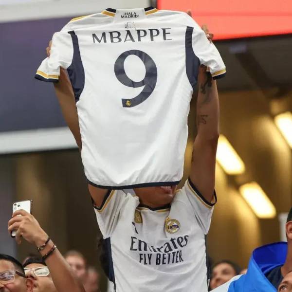 Kylian Mbappé aún pertenece al PSG, sin embargo los hinchas del Real Madrid ya lo sienten suyo. Prueba de ello es que los locales deportivos con el sello del cuadro español venden ya camisetas, bufandas y otros productos con el nombre del futbolista francés.