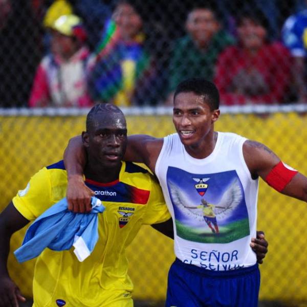 Antonio Valencia y Segundo Castillo celebran la clasificación de Ecuador al Mundial 2014( )