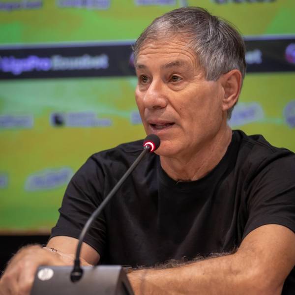 Holan en la rueda de prensa posterior al partido contra LDU. (Cuenta X @BarcelonaSC)