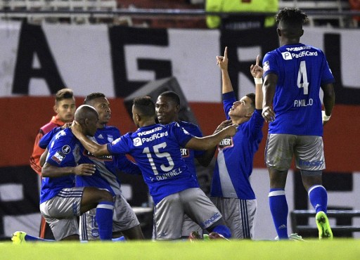 Ayrton Preciado (i.) ha anotado los 3 goles de Emelec en la actual Conmebol Libertadores. Foto: AFP