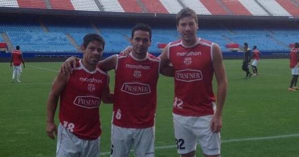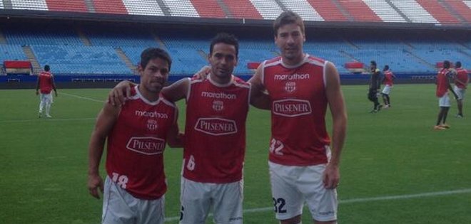 El defensa de Barcelona, Pablo Saucedo, mostró en su cuenta en la red social twitter una foto junto a sus compañeros Matías Oyola y Federico Nieto, en el estadio Vicente Calderón, que acogerá el cotejo.