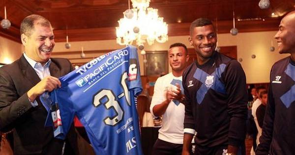Rafael Correa recibió una camiseta conmemoratica del bicampeonaio del Club Sport Emelec.