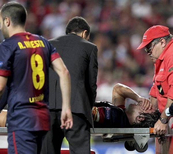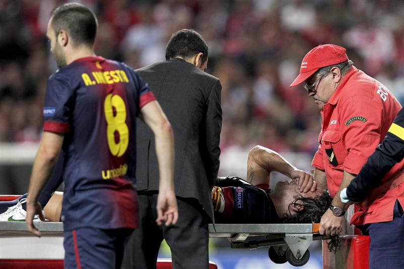 El capitán del Barcelona, Carles Puyol, sufrió este martes, en Lisboa, una grave lesión en un codo y tuvo que ser retirado en camilla el mismo día que volvía a los campos de juego tras dos semanas en el dique seco para el partido de la Liga de Campeones contra el Benfica.
