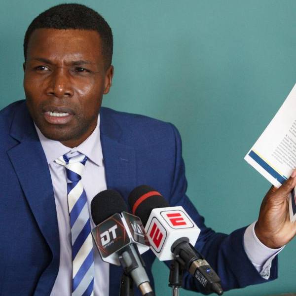 Carlos Tenorio, presidente de la Asociación de Futbolistas del Ecuador, en rueda de prensa( )