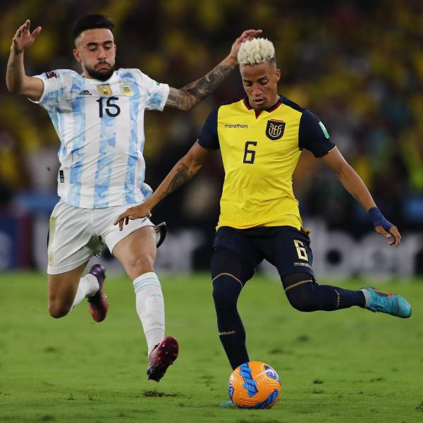 Byron Castillo, jugador de Ecuador (amarillo) disputa el balón contra Nicolás Otamendi (Argentina)( )