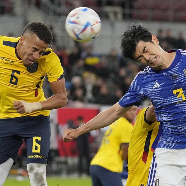 Byron Castillo, de la selección de Ecuador, disputa un balón por alto con Shogo Taniguchi, de Japón, en un partido amistoso disputado el martes 27 de septiembre de 2022, en Düsseldorf, Alemania (AP Foto/Martin Meissner)( )