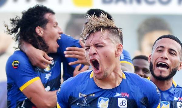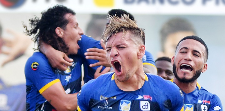 Carlos Garcés grita uno de sus goles con Delfín. Foto: API.